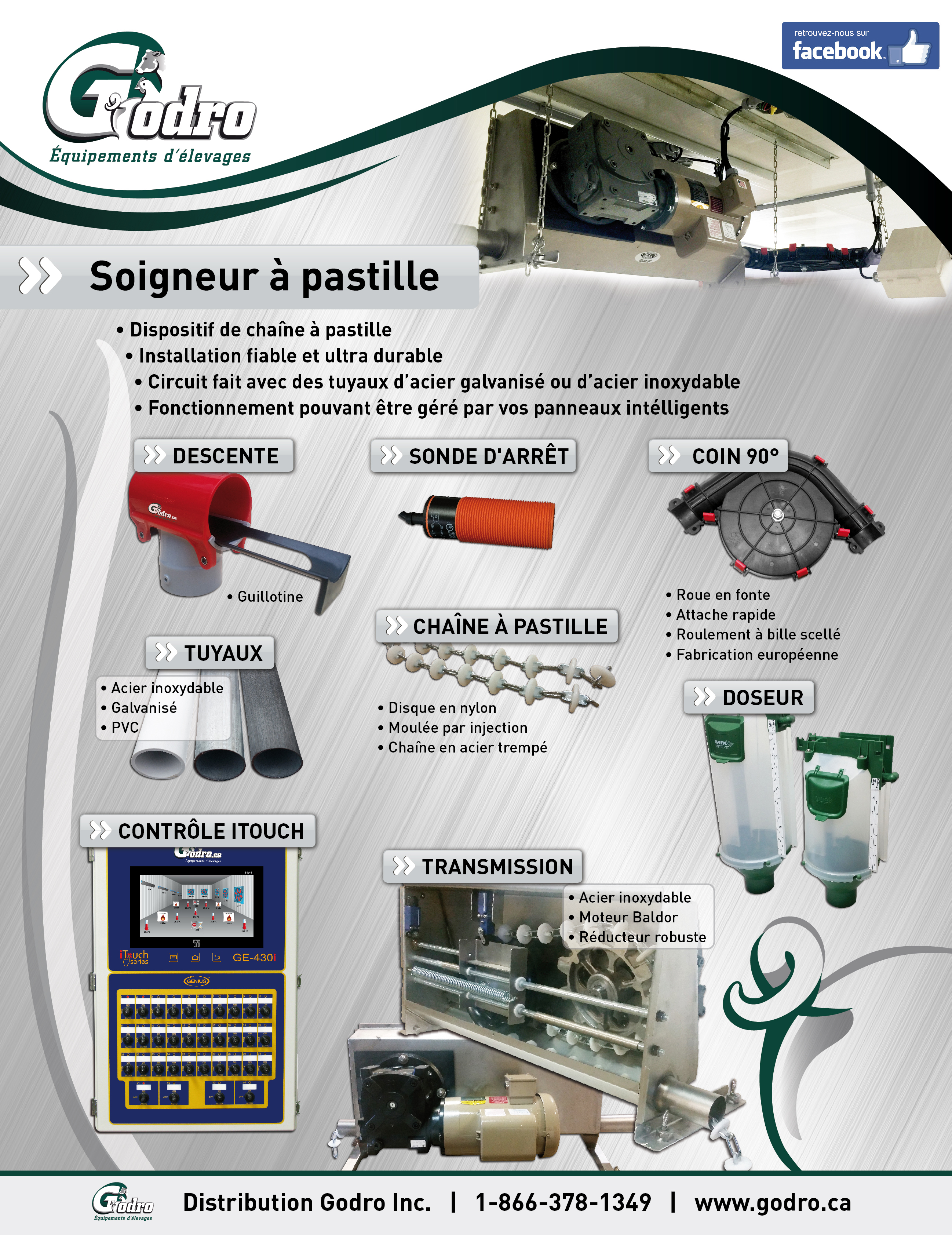Notre marque Godro offre une valeur et une performance exceptionnelles pour les besoins de vos animaux. Nous proposons des lignes complètes de systèmes, Vis flexibles, Soigneur à pastilles, ainsi qu’un vaste inventaire de pièces pour nourrir vos animaux. En ce qui concerne les systèmes d'alimentation de votre ferme, faites confiance à notre savoir-faire pour fournir les meilleurs produits et services de l'industrie.
